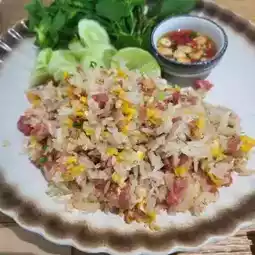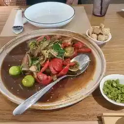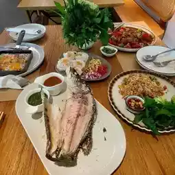 #Secret shop An Isan restaurant that is more than just an Isan restaurant. It sells Isan food, a coffee cafe, and a fresh coconut milk ice cream shop. It is truly a one-stop shop. The interior of the shop is simply and comfortably decorated. You can eat as a family or have a simple meal for one person. Everything looks perfect. The atmosphere of the shop is clean and the staff are polite. The manager is very friendly and can give good advice, including the food menu. Type of food: Tam Surin, don't be afraid of fermented fish, the smell will definitely stick. In addition, there is a Miang Pla Kapong menu, grilled to a good texture, not smelly, the size of the fish is just right, not too big. Inside the set, there are many side vegetables to eat with rice vermicelli sprinkled with fried garlic and peanuts, including sliced shallots and thinly sliced chili, fried rice with sour sausage, eaten with fish sauce and chili, salmon fermented salad, eaten with kathin seeds and crispy pork rinds, the taste is very spicy and delicious. In addition, there is a menu of fried eggs. The coffee at this shop tastes very good and fragrant. In addition, the shop is kind enough to give each person a free scoop of fragrant, sweet, rich coconut milk ice cream.