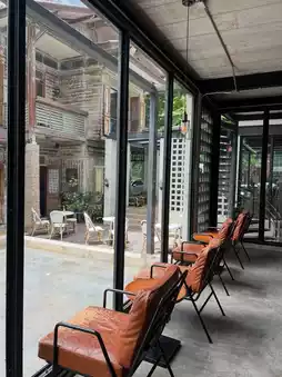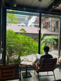 Here there is an air-conditioned zone and an outdoor zone. Both are chill. The indoor zone will be a seat facing the glass, allowing you to see the view outside. It feels very relaxing. The outdoor zone will be a shared area with the restaurant next door, open, comfortable, not too hot. You can walk around and take pictures from many angles.