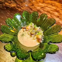 This is just part of the 10-dish course. Each dish is made with great care. The flavors are perfect. I must say that the food, the atmosphere are delicious and the vibes are very good.