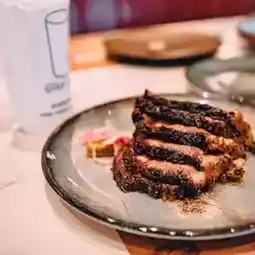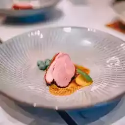 The restaurant's ceiling is uniquely designed, tall and artistic, with warm lighting and modern, simple decorations. The overall atmosphere makes people feel luxurious and comfortable.