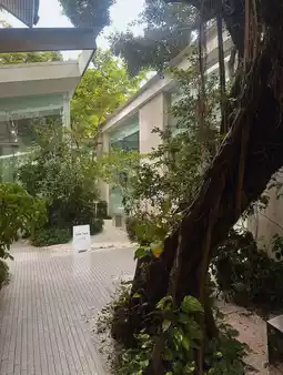 A forest with a few white buildings hidden in it, the whole is extended from a main house to form three pure white minimalist buildings in a row. The middle corridor is full of plants, creating a mysterious atmosphere.