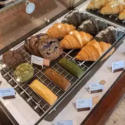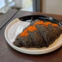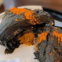 The cake baking is also very good. I ordered the popular Thai milk croissant. It has a bamboo charcoal black appearance and is sprinkled with bright orange radish bits. It is quite eye-catching. When you take a bite, the croissant is so crispy that the layers peel off, revealing the rich and sweet Thai milk filling. The whole taste is crispy but not too sweet, and delicious.