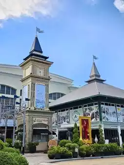 In the afternoon, the sun was out inside Asiatique, making the white decorations of the buildings and Ferris wheel stand out more vividly, creating a fantasy atmosphere as if we were in a white castle and its garden🏰