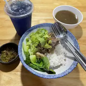 Photo 5 & 6: Chatuchak Weekend Market - Beef Noodles, Stir Fry Beef Rice with Butterfly Pea Drink