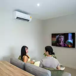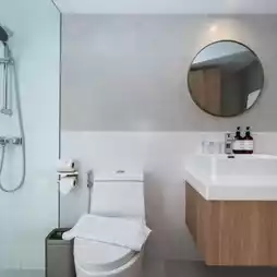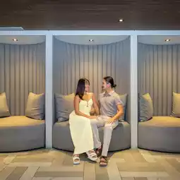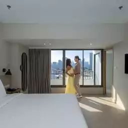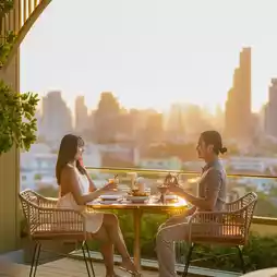The highlight of this place is the swimming pool. It's very minimalist and beautifully decorated in a modern style. The white pool contrasts with the brown wooden floor. It's an outdoor pool with a great view of Bangkok.