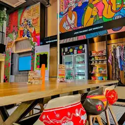 The atmosphere inside the hotel looks colorful and bright, decorated with graphics that tell stories about Chinatown. The common area has games to play, cool photo spots, and small items for sale.
