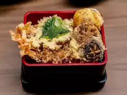 🍱Ten Bento, a rice bowl topped with tempura, including shrimp, Japanese boiled eggs, shiitake mushrooms, lotus root, and topped with the restaurant's special sauce.
