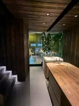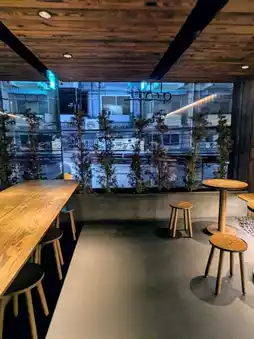 Ari, a trendy area in Bangkok, is home to many unique cafes and Japanese restaurants. Among them is 'qraft,' a Japanese-style cafe that specializes in matcha drinks and baked sweets. The cafe features a sleek, dark-toned, and wooden elongated space, exuding a sense of understated luxury and fashion. The second floor is equipped with a long mirror, making the space feel significantly larger.