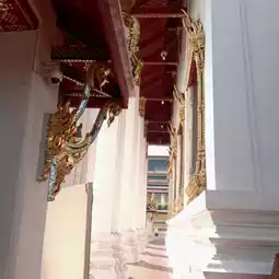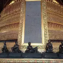 This temple has many important things. The carved wooden door panels by King Rama II, the most beautiful mural paintings in Rattanakosin, under the celestial cloth base of Phra Sri Sakyamuni, there are the royal ashes of King Rama VIII, behind the base of the Buddha, there is a stone slab carved in the Dvaravati art style, the Mayak Patiharn posture and the Sermon posture, which is the only one in the world.