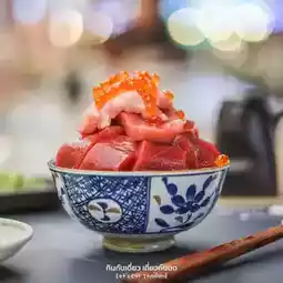 🚩 Maguro Tenkomori (1,250฿) Donburi with fresh maguro, large pieces, decorated with gradients from akami, chutoro, and otoro, topped thickly and tightly, you can't see the rice. Topped with salmon roe, adding another crunchy texture. This bowl is the best. You get to eat all 3 parts of maguro in one bowl.