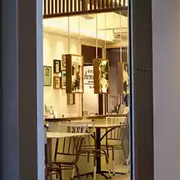 The atmosphere inside the shop is retro but mixed with modern, both in the choice of color tones of chairs and tables, interior decoration, and even photos that seem to tell the story of the shop.