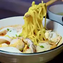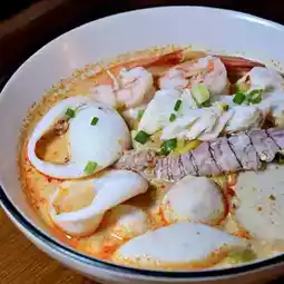 🍜 Seafood noodles, mantis shrimp, crab, tom yum, squeeze lime to add spiciness to the tom yum soup. The round noodles are soft and just right. The squid, shrimp, and mantis shrimp are firm.