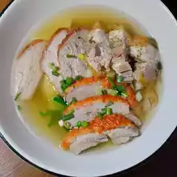 🍲 Wonton soup with red pork, crispy pork, roast duck, this bowl is very full of ingredients. The soup is sweet and well-rounded, the wonton dough is soft.