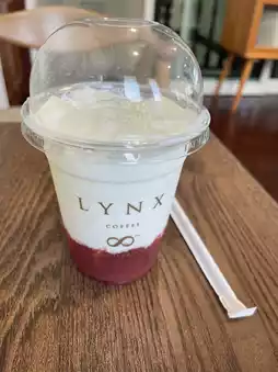 Today, we tried LYNX Cafe. We ate Banoffee Pie and Strawberry Milk. It tasted really good.