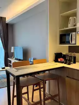 This time we stayed in a studio, which is about 400 square feet and has a terrace, a small kitchen, and a washing machine. It is suitable for families and has a very spacious space with a view of Bangkok.