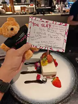 We took our drinks outside for some pictures and when we got back in to settle the bill, the whole team came out singing Happy Birthday, ready with party accessories, a cake and even a sash!