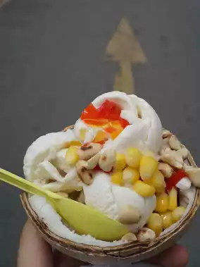 The adventure starts with the indulgent coconut ice cream, served in a coconut shell and generously topped with everything from sticky rice and peanuts to atap seeds. It’s the perfect refreshing treat to kick off our exploration in the sweltering Bangkok heat, and it never fails to hit the spot.