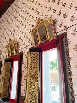 It is a brick and mortar building with a two-tiered roof covered with tiles. The surrounding porch is supported by pillars, decorated with gables, raka leaves, hongsongs, supports between the pillars, perforated tiles. The gable roof extends down another tier. The gable is decorated with glass. The front door And the back has 2 windows on each side, 5 windows on each side. Door frames and windows are decorated with stucco. The outer window panels are painted with water-based patterns. The inner ones are painted with oil dust and gold patterns such as the Cho Phaniang pattern. The ceiling has a double neck pattern all around, decorated with gold stars. The rafters are painted with Ta Samuk patterns. The ends of the rafters on both sides are painted with cone-shaped patterns. Above the frames, the windows are decorated with glass pictures in gold frames. The interior walls are painted with gold patterns of falling flowers. The Sima arches around the ordination hall are made of brick and cement. Each arch is decorated with a pair of carved stone Sima leaves. It is very beautiful and magnificent.