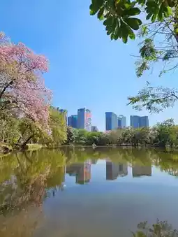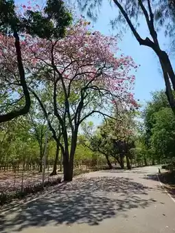 Another beautiful park in Bangkok, Railway Park is adorned with various flowers at the beginning of the year. The park is especially beautiful with the pink trumpet trees, which give off a Japanese vibe, leading many to call it the 'Sakura of Thailand.' The atmosphere is reminiscent of Japan, with pink flowers everywhere contrasting with the green trees. It's incredibly romantic.