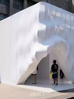 TCDC is like the center of this phase 1. You can see that Sansiri's booth is going all out with the brand's white tone, along with the modern design with curves. Even from the 5th floor of the General Post Office building, you can't take your eyes off it. Plus, at night, they play with the lights and colors, creating even more dimensions.