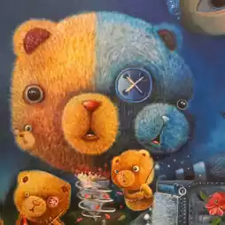 The artist was inspired by his own childhood memories, which were filled with happiness and a sense of security from his favorite toys, especially the teddy bear, which was like a close friend and a representative of love and warmth on a lonely day.