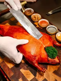 🦆เมนูหลักสุดพิเศษ เป็ดปักกิ่งหนังบางกรอบ อบด้วยไม้แอปเปิ้ล และสมุนไพรกว่า 12 ชนิด รสชาติอร่อยถูกปาก เมนูนี้พลาดไม่ได้ รวมถึง ผัดเปรี้ยวหวานเนื้อเป็ด และเนื้อเป็ดผัดซอสหม่าล่ารสเผ็ดร้อน เป็นหยินและหยาง ที่อร่อยแบบลงตัว