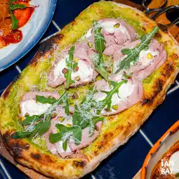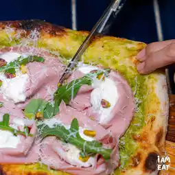 Freshly baked homemade pizza. They put in both zucchini cream and basil, topped with mortadella, which is a large Italian sausage, fresh cheese, pistachio, and rocket salad. Very delicious. I like it very much. The dough is chewy and soft. Eat it together with the sausage. It's like ham, it's a bit salty. When you meet fresh cheese, it will be even more delicious.