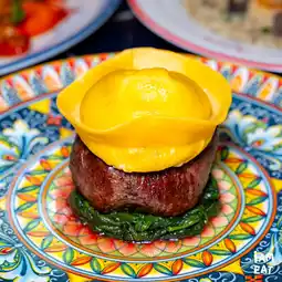 Authentic Australian Wagyu tenderloin steak, served with spinach and ravioli stuffed with creamy Cacio e Pepe sauce, very delicious. The meat is grilled very well, very soft.