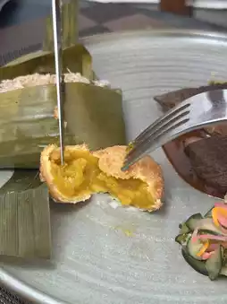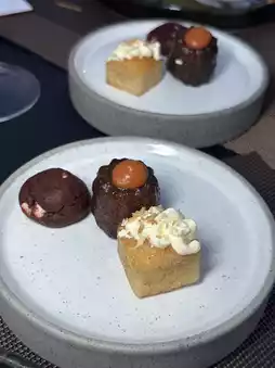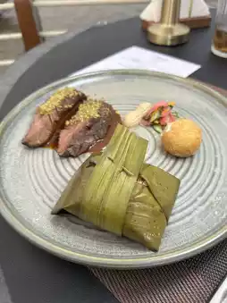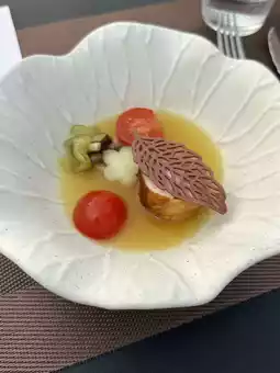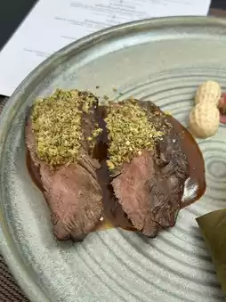 Grass-fed beef cheek with massaman sauce, pumpkin croquettes, pickled shallots, and peanut butter – This was my absolute favorite! As a Thai, I was blown away by how beautifully the massaman flavors were executed—a rare find these days. Paired with rice and pickles, it was perfection.