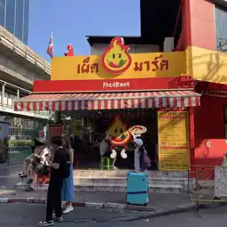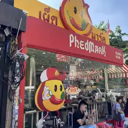 Phed Mark is a famous restaurant in Bangkok, known for its authentic Thai basil minced meat rice with a unique spicy flavor. We took a bus from Pattaya to Ekkamai station, and upon arrival, we saw the eye-catching red signboard and decided to queue up as there weren't many people waiting.