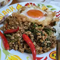 π Spicy Minced Pork Rice - This is the signature classic Thai dish. The minced pork is tender and juicy, with each bite bursting with rich spiciness and flavor.