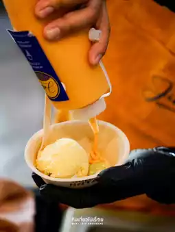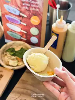 And finally, the Mango Sticky Rice Ice Cream menu, served with 3 types of sauces: Panang, Green Curry, and Tom Kha. The flavors are strange but go together very well. Each cup is about 89 baht, a dessert that impressively ends the experience of Thai rice.