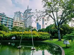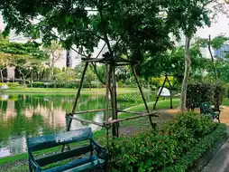 Bangkok, Thailand is a world-famous tourist resort city. Every day, thousands of tourists come to Bangkok for sightseeing and vacation. There are many urban oasis lake park attractions in Bangkok. This time we will introduce an urban oasis lake park attraction located in the center of Bangkok: Peace Park Santiphap Park (สวนสันติภาพ). It is free to enter the park, visit and take photos, and no tickets are required. The park is close to bus stops and subway stations, making transportation very convenient. The park is in a great location, 300 meters from BTS, 300 meters from Victory Monument, 100 meters from King Power Duty Free Shop, and there are four hotels at the entrance of the park, which is very convenient. The environment is very good. There are two ponds in the park, both with a lot of fish. One of them has a fountain and many pigeons. The nearby lawn is often used for picnics or sleeping. It is very clean and suitable for sports. There is a 750-meter running track in the park, which is suitable for jogging. Many people run from 5 pm to 9 pm. In addition, there is free aerobics starting at 6 pm, with hundreds of people participating. It is spectacular. There are also many facilities and large lawns suitable for children to play in the park, which is very suitable for bringing children here for parent-child games.