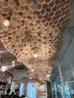 There's wall art, and a cup-like object that looks like the Milky Way on the ceiling!