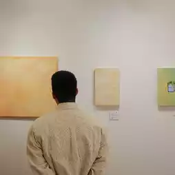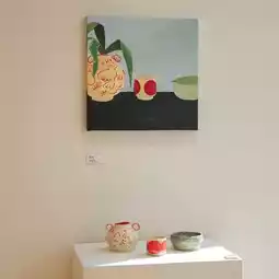 This exhibition invites us to explore and ask ourselves, "What is our safe space?" through artworks that emphasize simple but unique lines and colors. Each piece is an image of everyday objects, such as vases, plants, chairs, lamps, or trees, in which the artist uses soothing colors such as light green, blue, and yellow to create an atmosphere of calm.