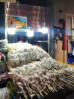 * Squid meat, 3 skewers for 100 baht, very tough and not fresh, can't chew it all. Squid tentacles, 100 baht per skewer, okay, not too tough, just right.