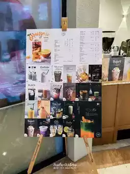 The menu focuses on drinks, with all types, including coffee, tea, and non-caffeinated drinks such as milk, fruit, and soda. The starting price is a lovely 60 baht, perfect for office workers like us.