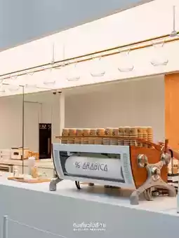 % Arabica, a Japanese coffee brand, has opened its newest branch in a grand way at One Bangkok. It stands out on the corner, beautifully reflecting the light. Inside, there are 2 floors. This is considered the first branch to have 2 floors. The front of the shop is decorated in white, matching the atmosphere inside, which uses warm tones of wood. Honestly, if you are in a hurry in the morning, stop by to buy coffee before going to work and you will receive good energy.