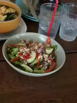 A cute cafe around Ngamwongwan. For those without a private car, you can take a taxi from Chatuchak. We went around 11:00 AM. The advantage is that there aren't many people, but the downside is that the sun is very strong. However, they have both indoor and outdoor zones. After taking pictures, you can escape the heat inside. The flowers are very beautiful, and there are many photo spots. The food is delicious. My favorite is the spicy cucumber salad. Overall, this place is great. Highly recommended.
