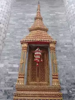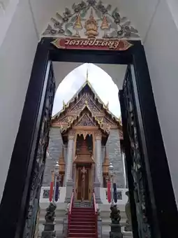 This temple was built of marble from Italy. The royal chapel has a front and back porch, a gable made of beautifully carved wood, and the window and door arches are decorated with stucco crown-shaped patterns, making it a beautiful temple of King Rama IV.