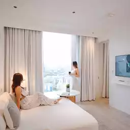 𝙄𝙉𝙉𝙎𝙞𝘿𝙀 𝙗𝙮 𝙈𝙚𝙡𝙞𝙖 𝘽𝙖𝙣𝙜𝙠𝙤𝙠 𝙎𝙪𝙠𝙝𝙪𝙢𝙫𝙞𝙩 𝙇𝙞𝙛𝙚𝙨𝙩𝙮𝙡𝙚 𝙃𝙤𝙩𝙚𝙡 has a unique and beautiful design. The emphasis is on using a comfortable white tone to decorate beautifully and perfectly. 💫 We stayed in the 𝙏𝙝𝙚 𝙏𝙤𝙬𝙣𝙝𝙤𝙪𝙨𝙚, a very spacious room with a living room area, a dining table corner, and a bedroom and bathroom that are perfectly divided. The room is not narrow and has a large glass window to enjoy the 𝘾𝙞𝙩𝙮 𝙑𝙞𝙚𝙬.
