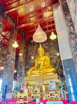At the temple, the ritual to resolve karma at Wat Suthat is very popular right now. Those who are into spiritual practices must not miss this. Those who feel that their luck is stuck right now, whatever they do has obstacles, or want to adjust their luck, increase their life's success, must try this place.