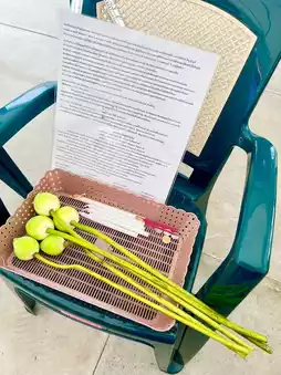 5. Return the basket and prayer sheets, hold the lotus flower and 5 baht coins, and walk inside.