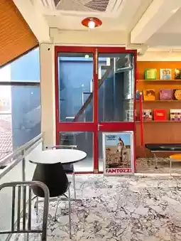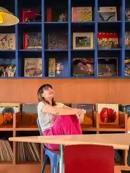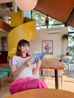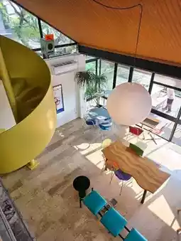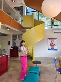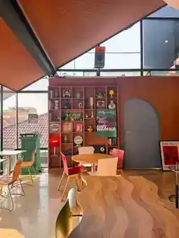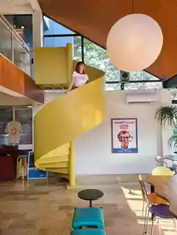 A cafe with a cool design decorated with furniture in colorful tones, looking chic like Gen Z teenagers. It will definitely please those who love taking pictures because there are many photo spots here. They decorated it with a curved staircase, making it look interesting. They used bright colors to decorate it with posters and records, giving it a great vibe. Anyone who comes to this cafe will definitely love it.