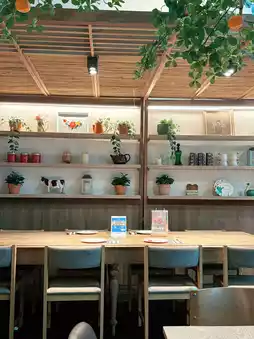 From the moment you step in, you're greeted by a cute duck mascot at the counter. The space is decorated with lush greenery, giving a fresh and vibrant feel. Inside, the colorful decor creates a cheerful, energetic vibe, complemented by large plants around the seating areas.