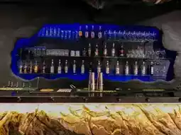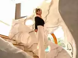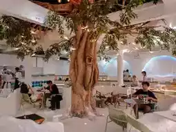 The ground floor is decorated in white tones like being at the beach. The upper floor is a bar in cool dark black.
