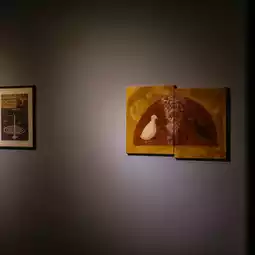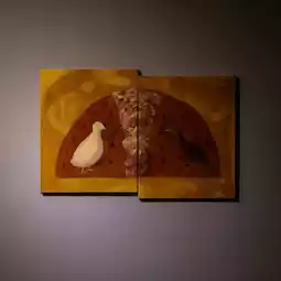 This exhibition presents paintings that are based on abstract and symbolic approaches. The artist chooses to “arrange images in pairs” to reflect polar opposites such as darkness-light, sleep-awake, ancient world-religious world.