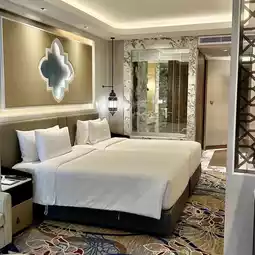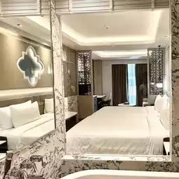 Valia Hotel Bangkok Valia Hotel Bangkok is located in a traditional community near Bangkok's Klong Toei Market. It is surrounded by many local food and shopping malls, where you can experience Bangkok's local culture. The hotel is magnificently designed with Thai cultural imagery. The background of the service counter is decorated with a golden tree of life, which is the Bodhi tree commonly seen in Buddhism and a common cultural image in Thailand. The guest rooms are decorated in a magnificent style. The bedroom uses short-pile carpets and copper lamps. The bathroom is luxuriously decorated with marble throughout the room, which is very luxurious. The bathroom space is luxuriously equipped with double sinks and large mirrors, and the design style is all marble. Public facilities are concentrated on the 6th floor, including a semi-open-air swimming pool, a children's paddling pool, a gym and a conference room. There is also a BelleValia pool bar next to the swimming pool.