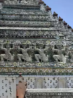 Putting aside the rural legends, the architecture of Wat Arun actually condenses religious imagery and construction techniques. The 82-meter-high main tower, Phapuram, is actually built with the image of Mount Sumeru, the center of the Buddhist universe. It has a square shape and the tower is stacked layer by layer. The first layer is dedicated to the wind god, the second layer is for the Yaksha, the next is for the monkey god, and the last layer symbolizes the heaven with a sculpture of Indra. The top of the tower is Lord Vishnu riding on the Garuda, which is full of Hindu colors and characteristics.