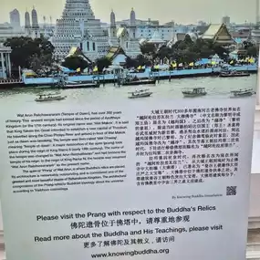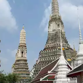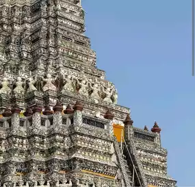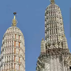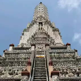 Wat Arun is one of the most representative Buddhist temples in Thailand and an important landmark in Bangkok, located on the west bank of the Chao Phraya River. Its Thai name is Wat Arun Ratchawararam Ratchawaramahawihan, often referred to as Wat Arun, and its Chinese name is "Temple of Dawn" or "Temple of Zhengwang". The most striking feature of this temple is the central tower (Prang), which is 70 meters high and decorated with colorful ceramic pieces and shells, sparkling and very spectacular.